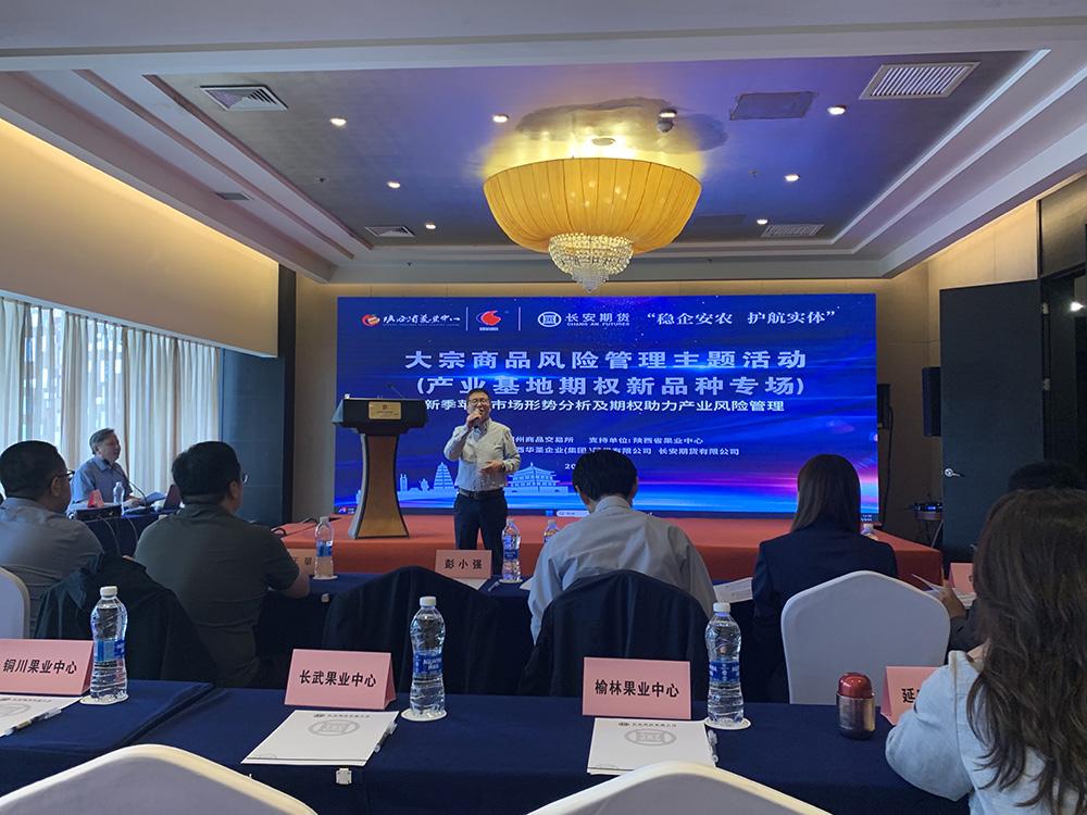 为帮助苹果产业梳理旧果季产销形势、了解新果季生长情况,学习期权知识,充分利用期权工具降低经营风险,实现稳定经营。9月25日,陕西华圣企业(集团)股份有限公司在郑州商品交易所、中国期货业协会、中国中小企业协会的支持下,联合陕西省果业中心、长安期货有限公司共同举办“稳企安农·护航实体”产业基地会议。此次会议围绕新果季苹果生长状况与市场未来形势分析展开,参加会议的有各地果业中心负责人、产业企业代表和期货公司等百余人。陕西省果业中心副主任杨建伟、华圣农业集团执行总经理彭小强、长安期货副总经理郭苏娅出席了会议并致辞。会上,陕西省果业中心杨建伟主任总结回顾了过去2022年苹果产销情况和气候因素对苹果生产的影响,分析并展望2023产季苹果销售形势,对全省中小果品企业提出了切实有效的建议。长安期货分析师马舍瑞夫主要介绍了期权基础知识以及期权套保的介绍,为与会人员讲解了期权的基础知识。华圣集团期货交易部经理王攀从专业知识角度介绍分享了期权操作中企业应用期权风险管理案例的分析。会议最后,各地果业中心代表分享了新果季苹果产量、质量的基本情况和本次会议的心得体会。交割库企业代表交流了对新果季苹果产销市场的看法,并就苹果期权提出了意见和建议。通过与会代表和嘉宾的热烈讨论,加深了苹果产业从业者对苹果期权的认识,增加了苹果期权在西部市场的影响力,有助于实现苹果产业的高质量发展。