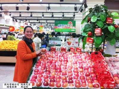 她,细心、勤勉、极富工作热情;她,热爱工作,积极乐观的对待每件事情。她看起来外表柔弱,但是面对挑战,她从未退缩。对她来说压力就是动力, 2012年4月做为西南区直营拓展经理,她积极跟进昆明家乐福直营系统的开发进度,关注门店日常销售,及时与当地业务员就门店销售等各项业务给予辅导和支持。在重庆新世纪系统的合作中,招聘、培训以及店面管理等环节,她亲力亲为,使得新世纪各门店正常上架销售并取得良好的销售业绩。