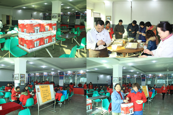 2014年12月22日是传统节气——冬至,为了让大家吃到可口的水饺,餐厅提前包制了各种各样的水饺。冬至当天,为活跃员工就餐气氛,行政部协同工会为大家准备了精美的礼品,把10个象征着好运的红枣分别包制在十个水饺中,十名吃到包有红枣水饺的员工幸运中奖,他们兴高采烈地领到一个不锈钢双层蒸锅。